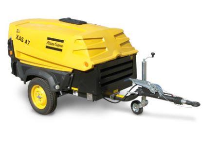 Luchtkompressor aangedreven door een diesel motor, als aanhangwagen te trekken, te huur i.c.m. breekhamer, palenrammer.