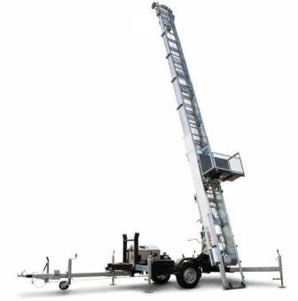 Eenvoudige ladderlift die tot max. 24 meter kan rijken, aanhanger model met draaikrans om de ladder in de juiste positie te krijgen.